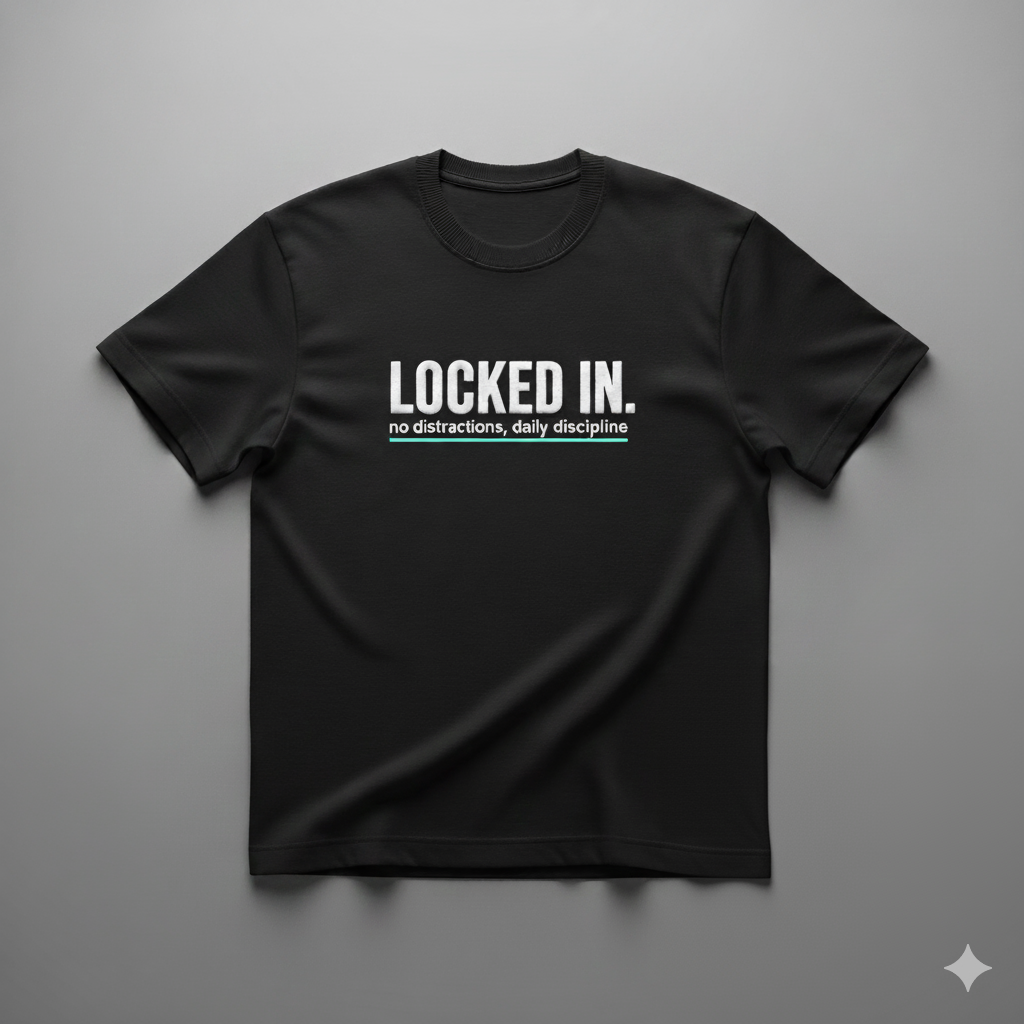 The Locked In T-Shirt is made for those who live by discipline and consistency. With a bold “LOCKED IN.” print and the line no distractions, daily discipline, this tee captures the mindset of relentless focus and hustle.